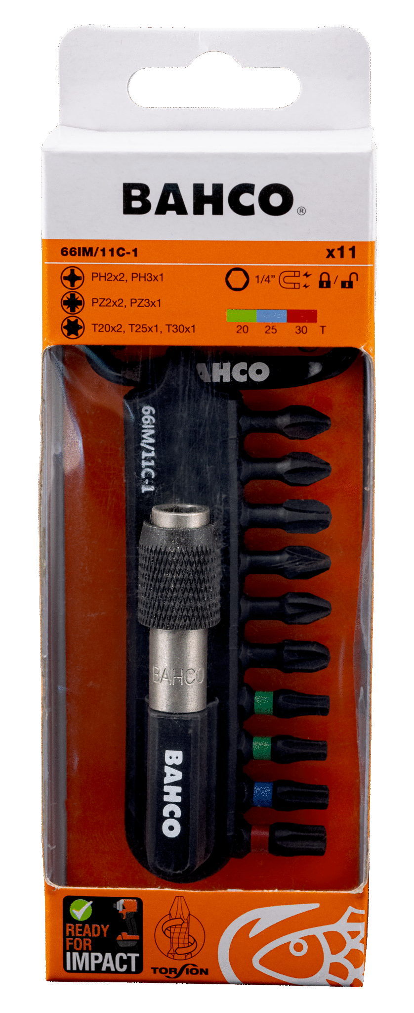 Jeu d'embouts à choc usage intensif 1/4" pour vis à Phillips, Pozidriv, TORX® dans un étui plastique - 11 pcs Bahco 66IM/11C-1